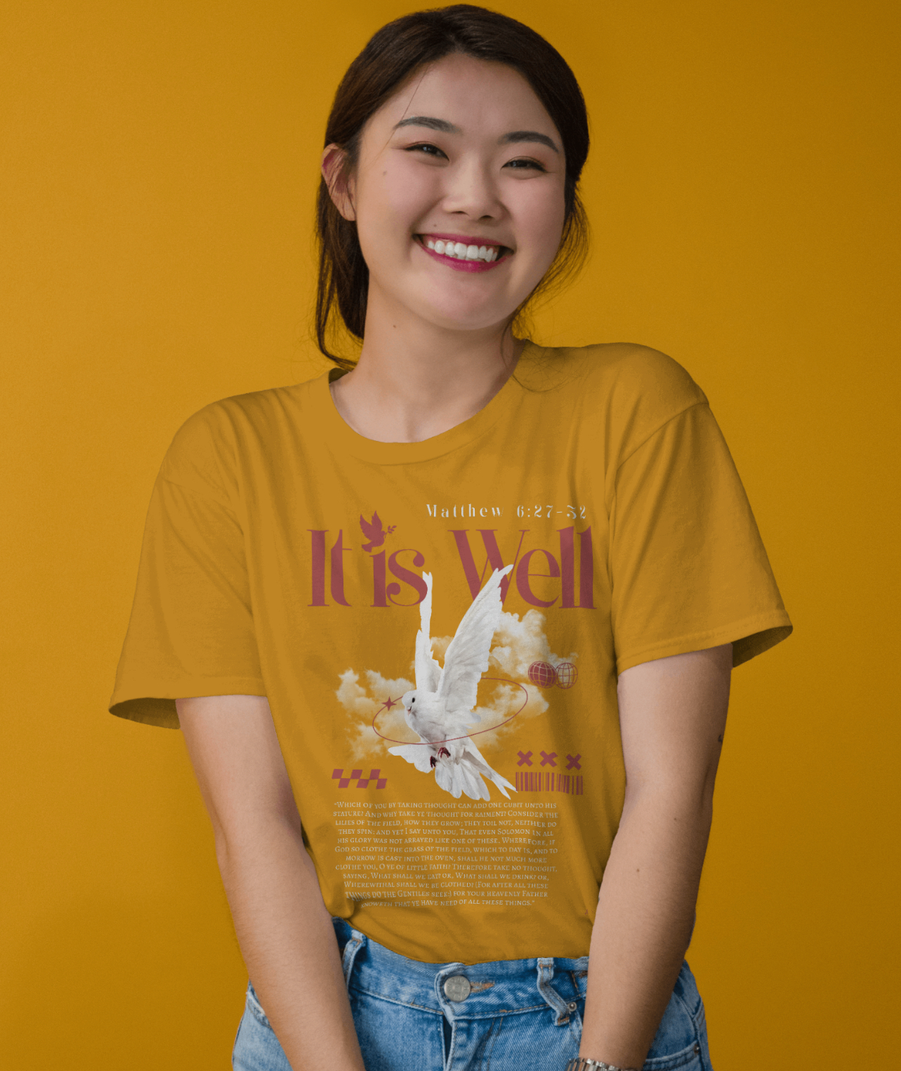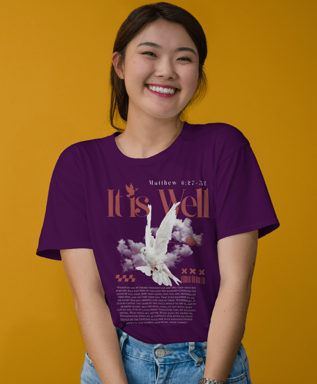 This “It Is Well” shirt is inspired by unwavering faith in the midst of life’s uncertainties. Featuring a graceful dove in motion, the design symbolizes peace, hope, and the quiet assurance that comes from trusting God completely—no matter the season.
