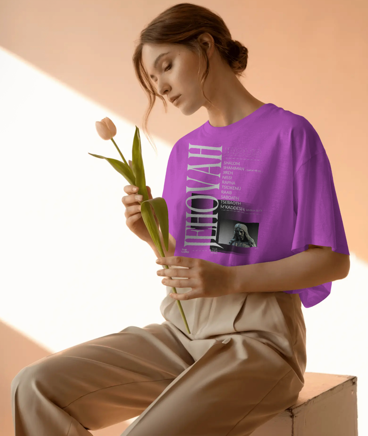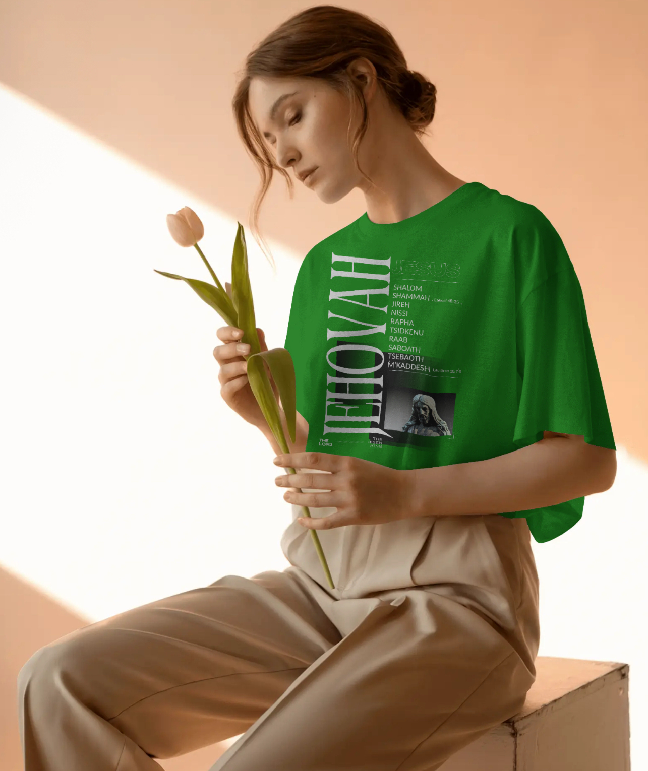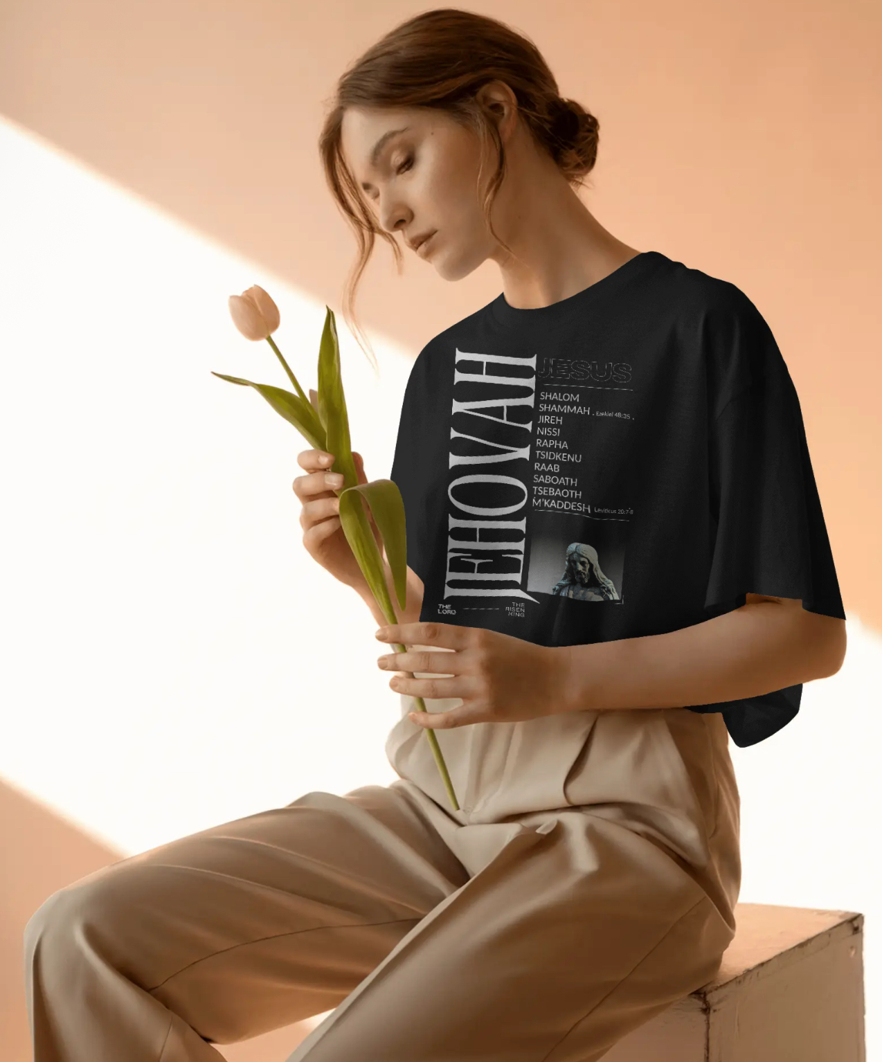 This “Jehovah” shirt honors the many names of God—each one revealing His character, power, and promise. Featuring a striking, modern layout with a reverent image of Christ and references to God’s covenant names (Jehovah Jireh, Shalom, Rapha, Nissi, Tsidkenu, Sabaoth, M’Kaddesh), this design serves as both a statement of faith and a reminder of His constant presence.