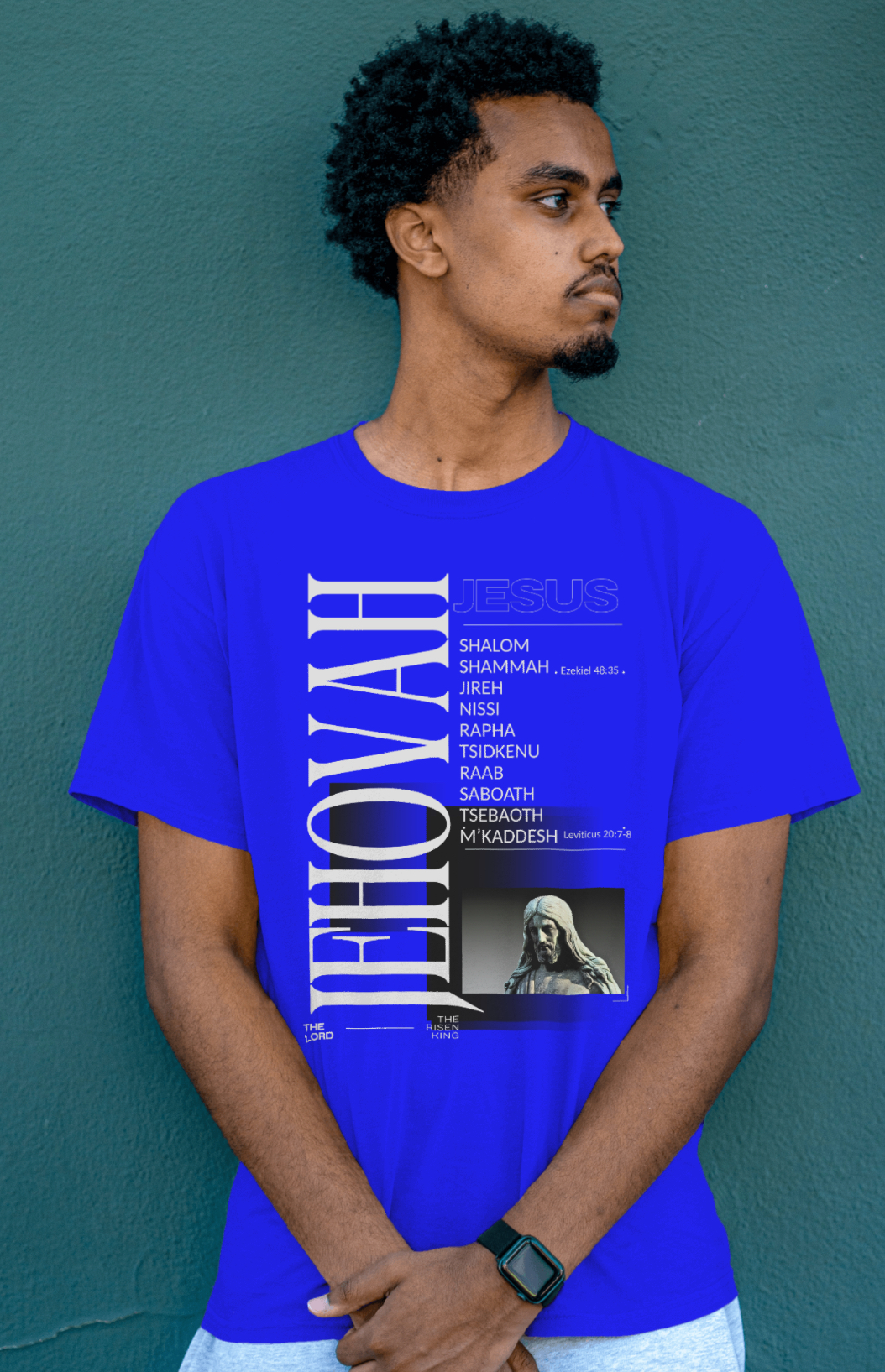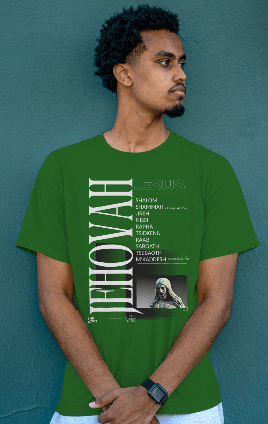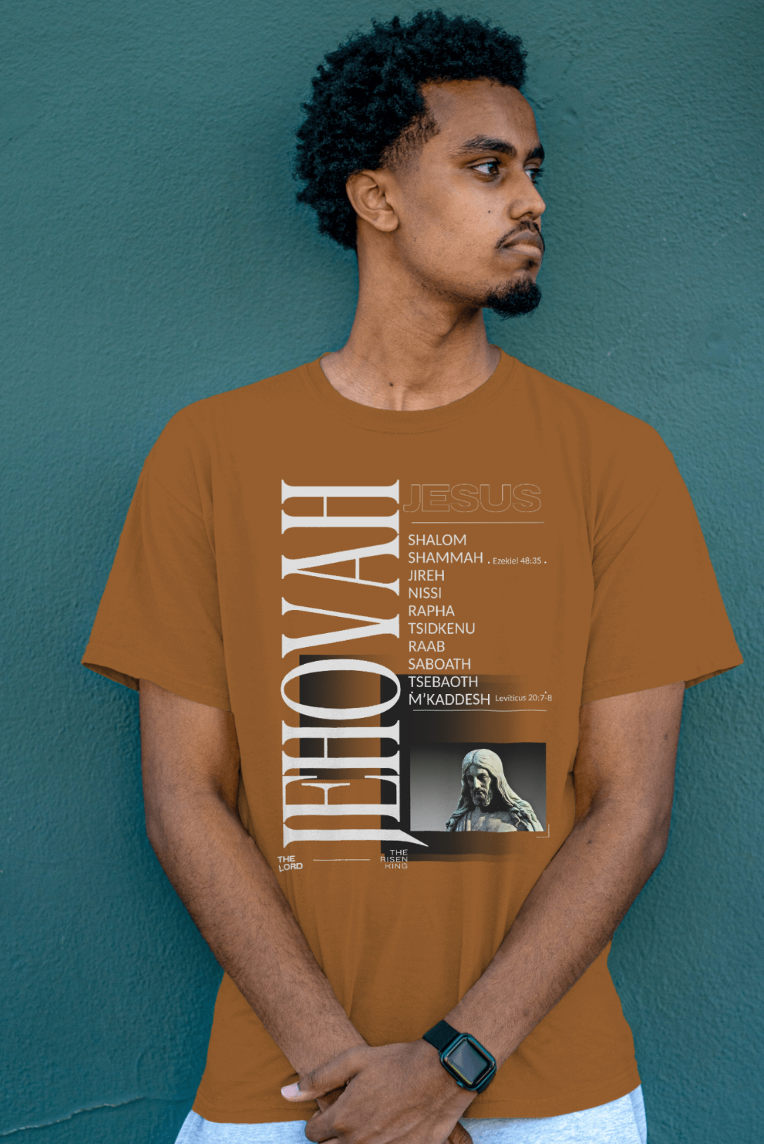 This “Jehovah” shirt honors the many names of God—each one revealing His character, power, and promise. Featuring a striking, modern layout with a reverent image of Christ and references to God’s covenant names (Jehovah Jireh, Shalom, Rapha, Nissi, Tsidkenu, Sabaoth, M’Kaddesh), this design serves as both a statement of faith and a reminder of His constant presence.
