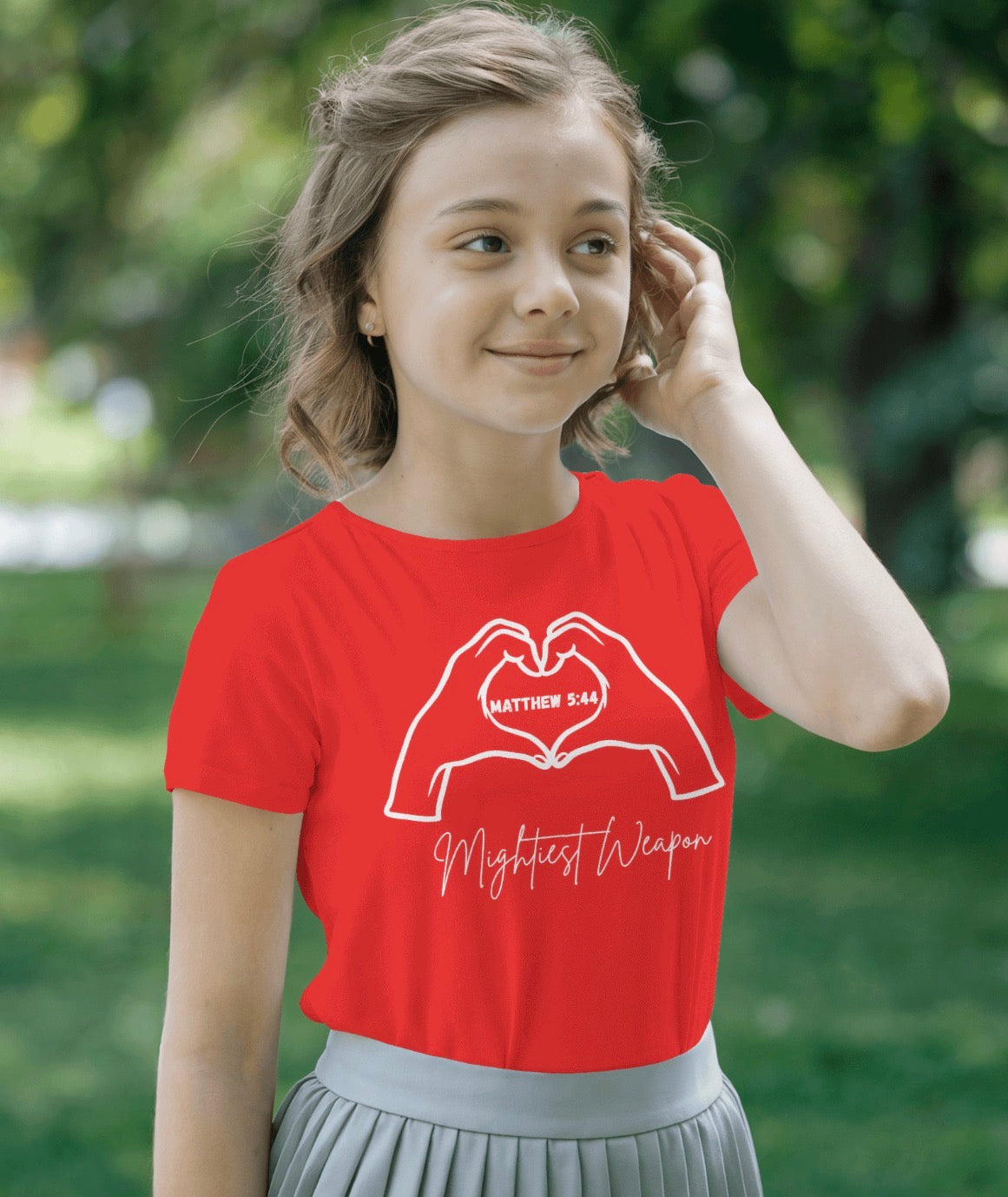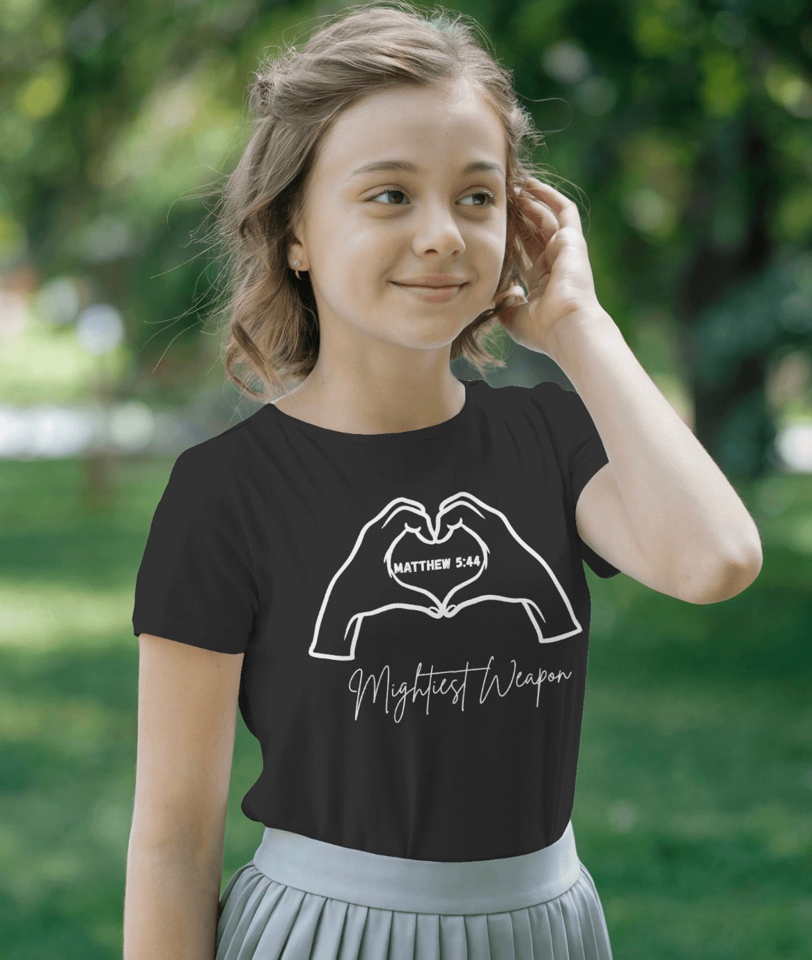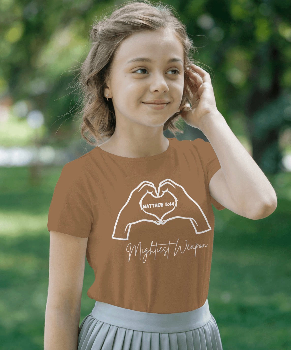 The Tee features hands forming a heart around Matthew 5:44, reminding us that choosing love is one of the strongest acts of faith.