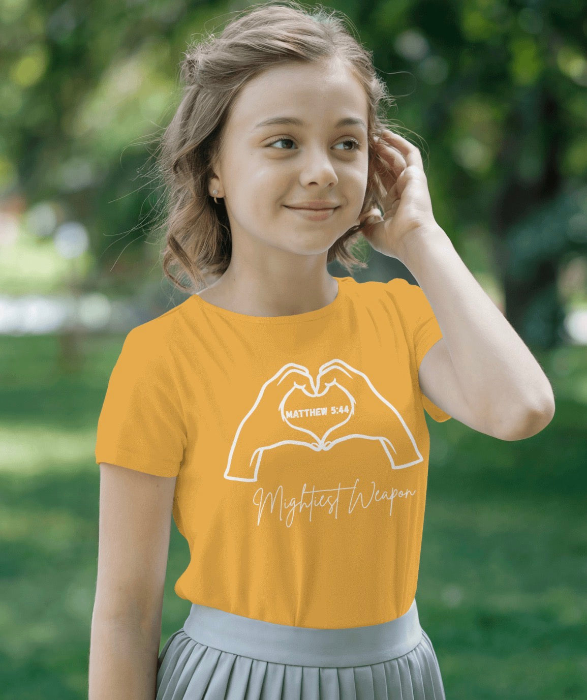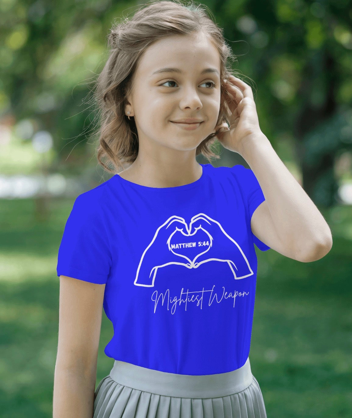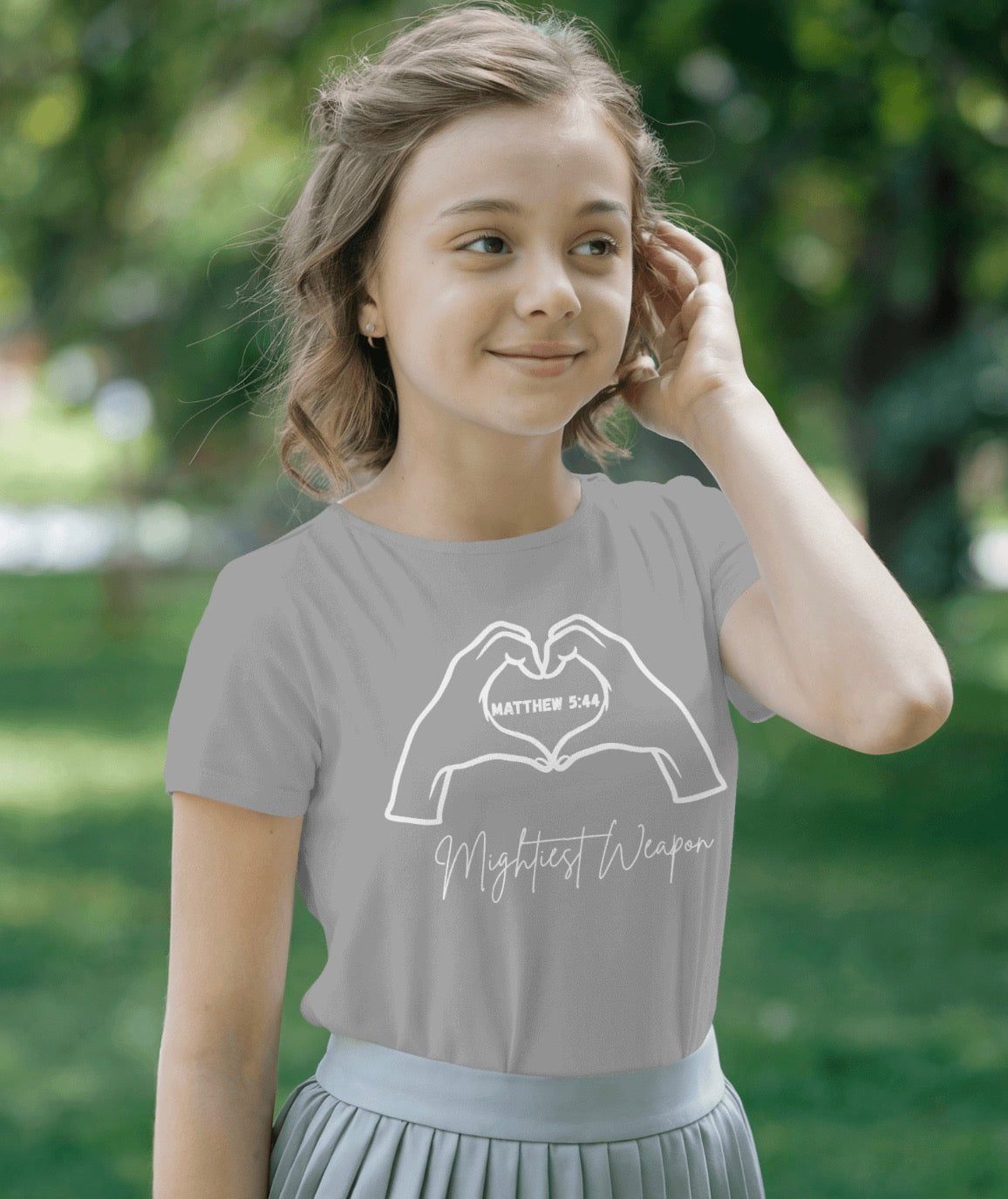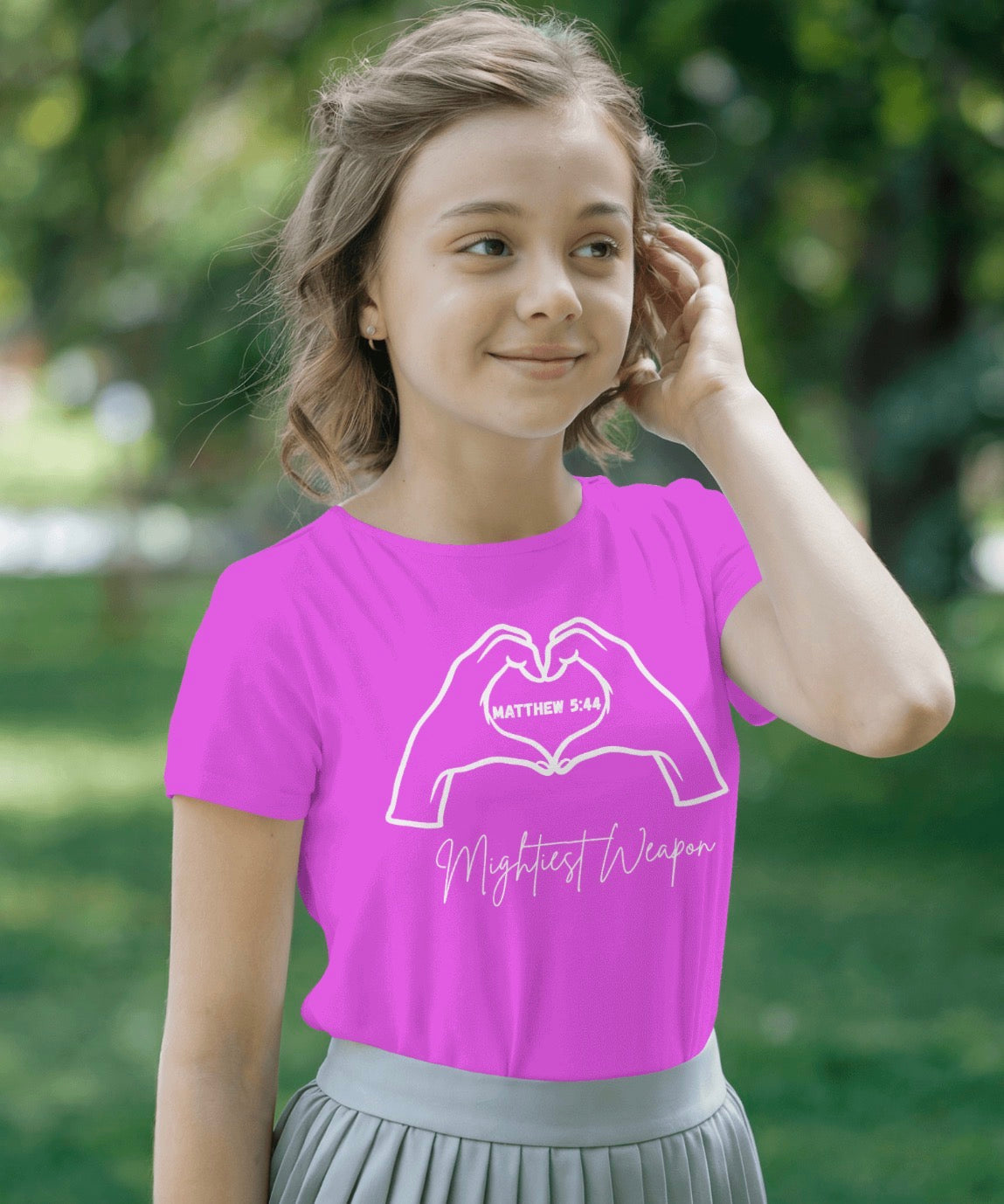 The Tee features hands forming a heart around Matthew 5:44, reminding us that choosing love is one of the strongest acts of faith.