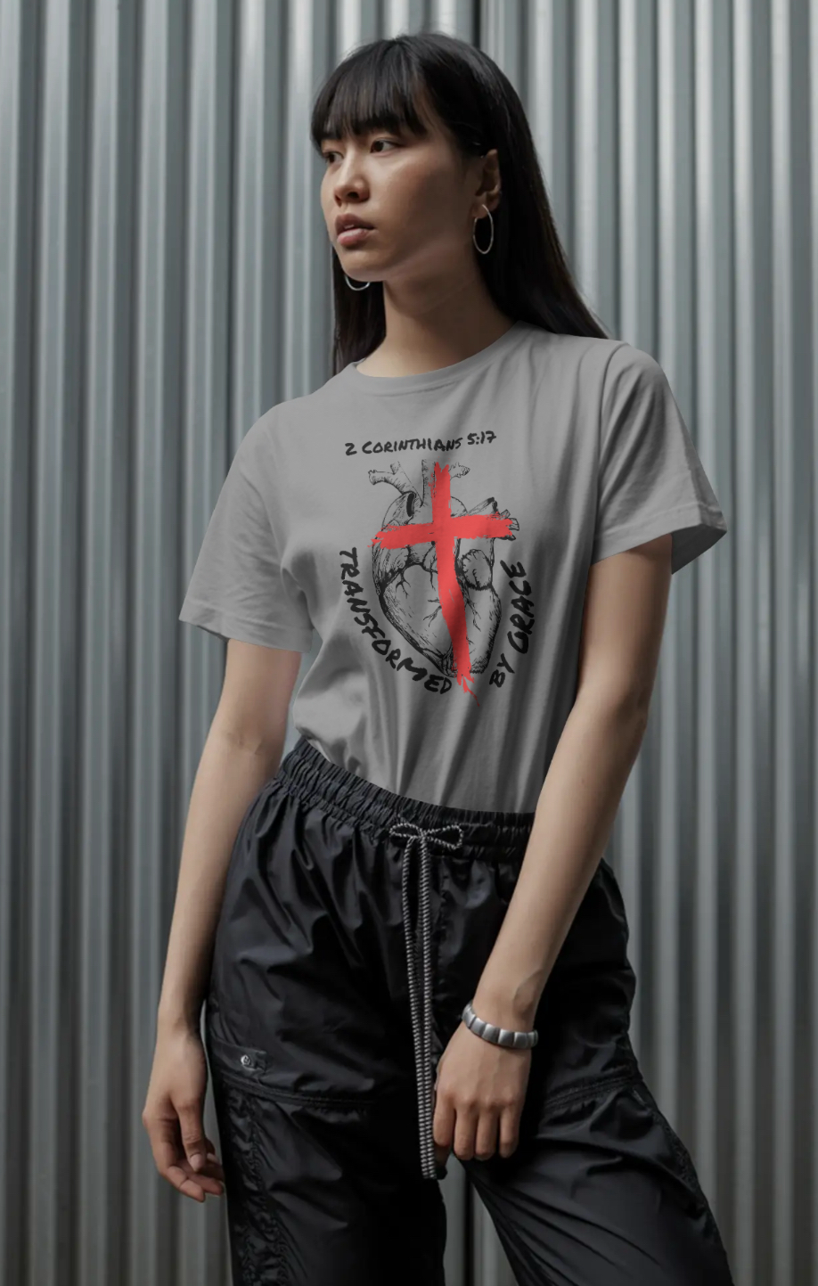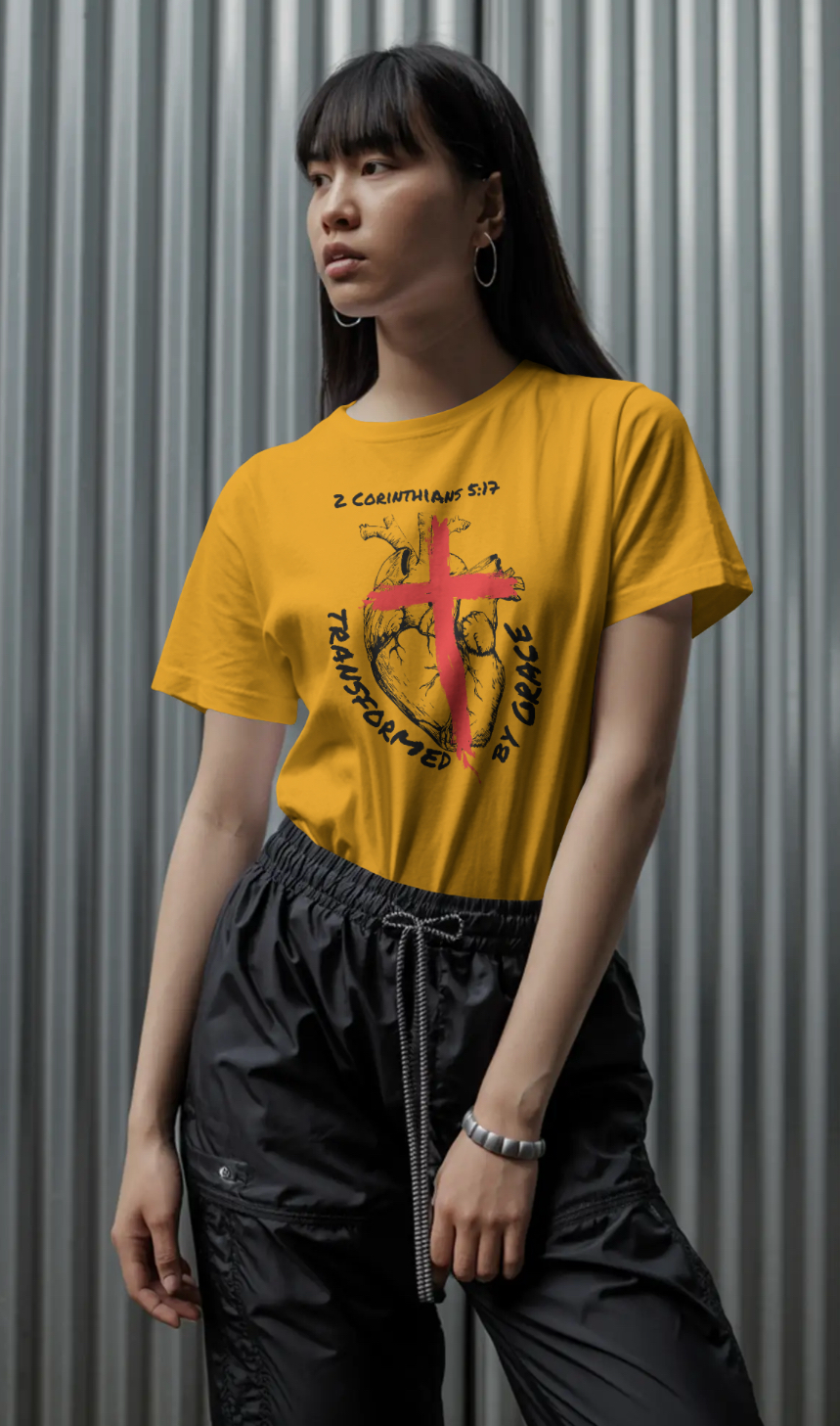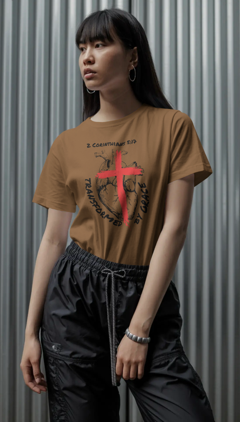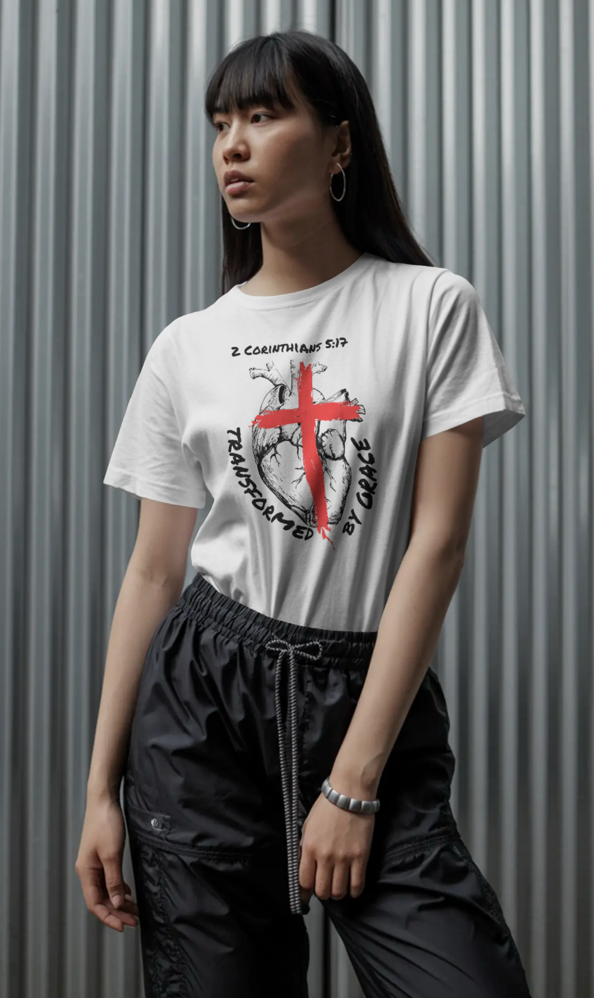 Inspired by 2 Corinthians 5:17, the design features an anatomical heart marked by the cross — symbolizing the moment of surrender where the old life ends and a new one begins. The powerful words “Transformed by Grace” reflect the truth that change doesn’t come by perfection, but by Christ.