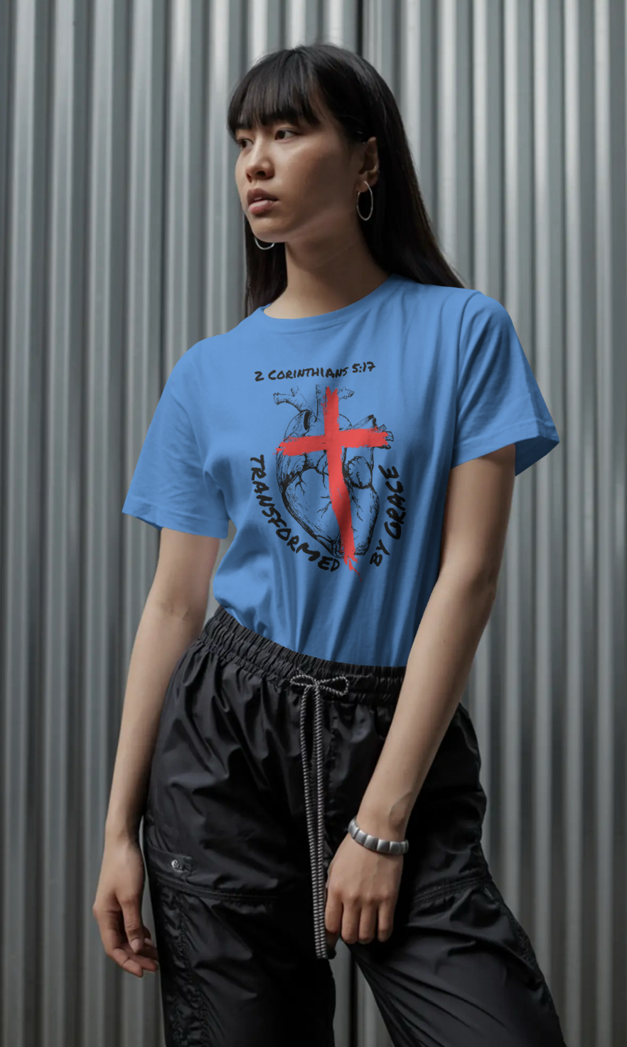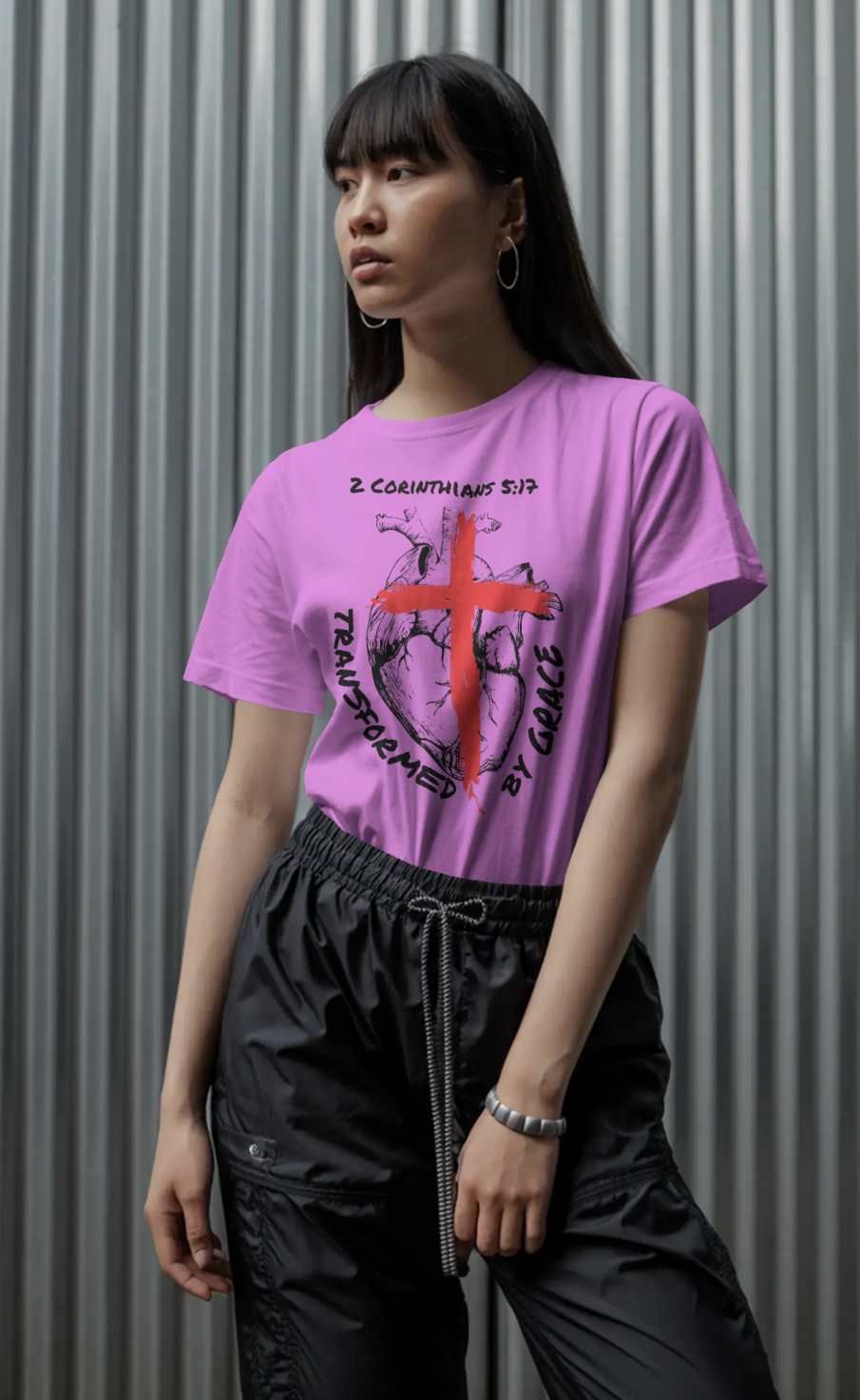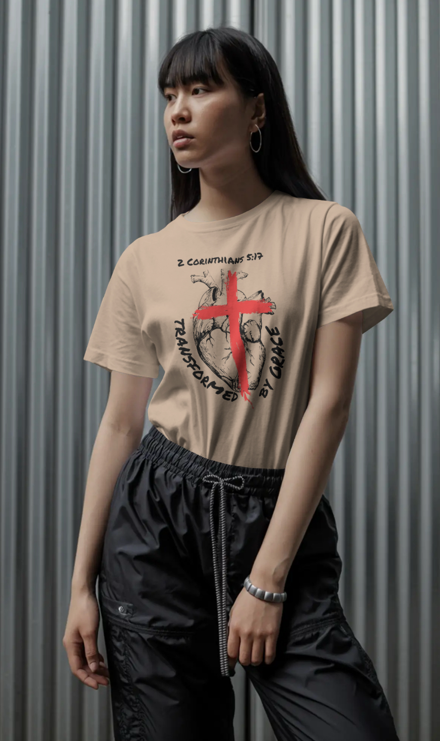 Inspired by 2 Corinthians 5:17, the design features an anatomical heart marked by the cross — symbolizing the moment of surrender where the old life ends and a new one begins. The powerful words “Transformed by Grace” reflect the truth that change doesn’t come by perfection, but by Christ.