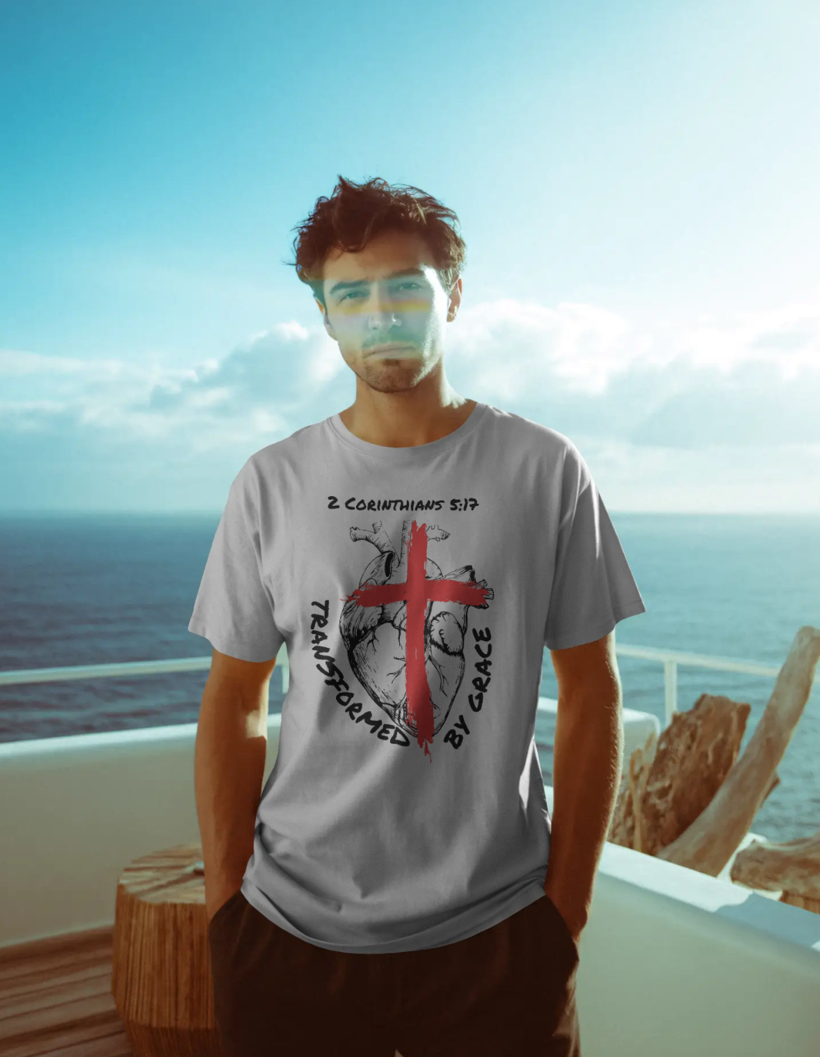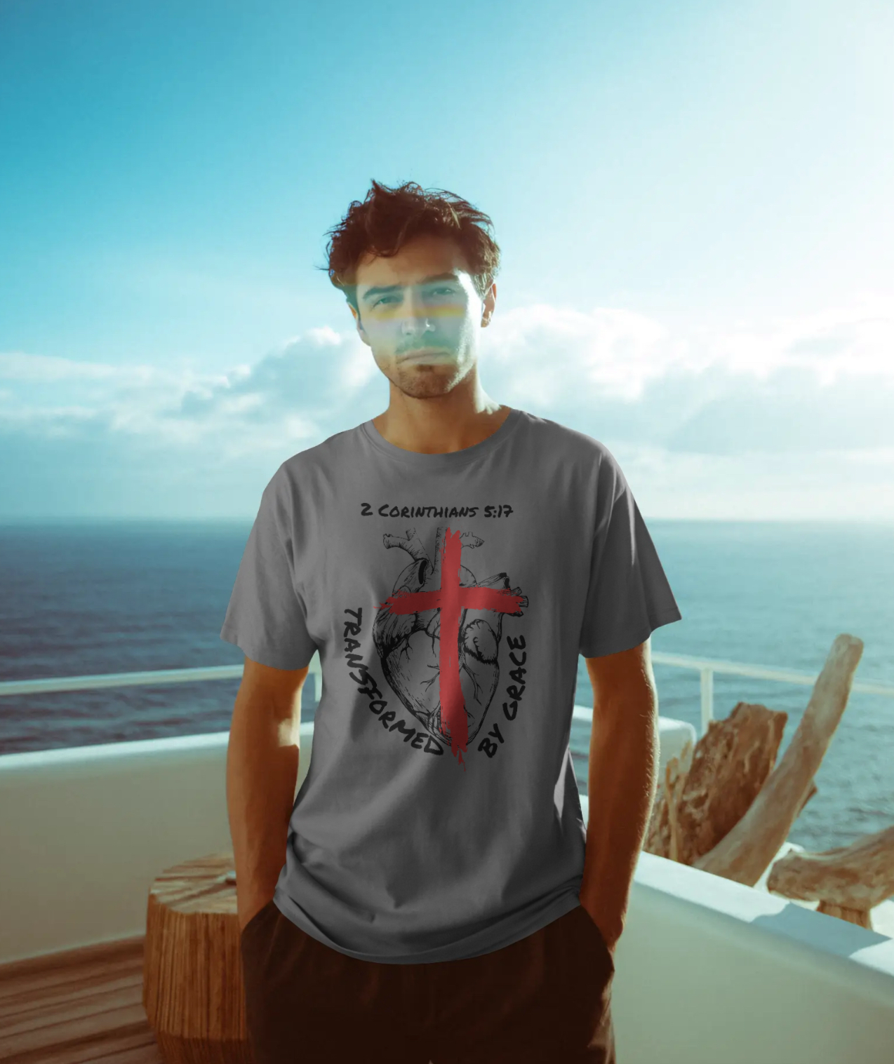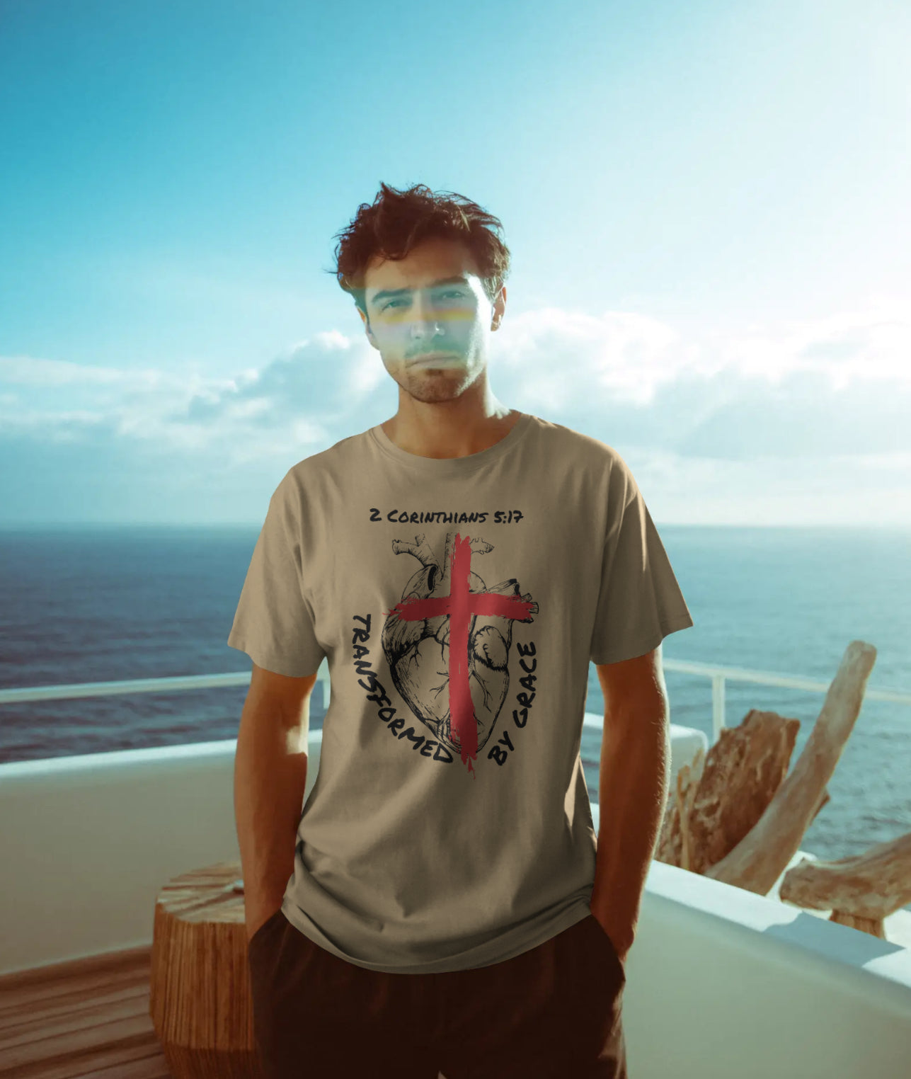 Inspired by 2 Corinthians 5:17, the design features an anatomical heart marked by the cross — symbolizing the moment of surrender where the old life ends and a new one begins. The powerful words “Transformed by Grace” reflect the truth that change doesn’t come by perfection, but by Christ.