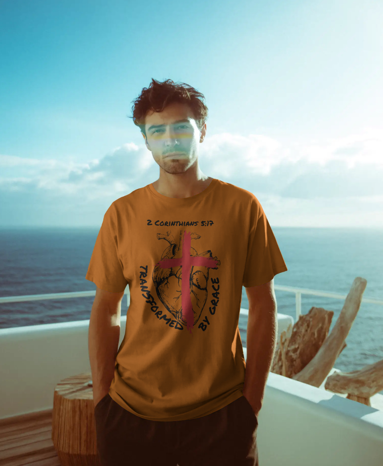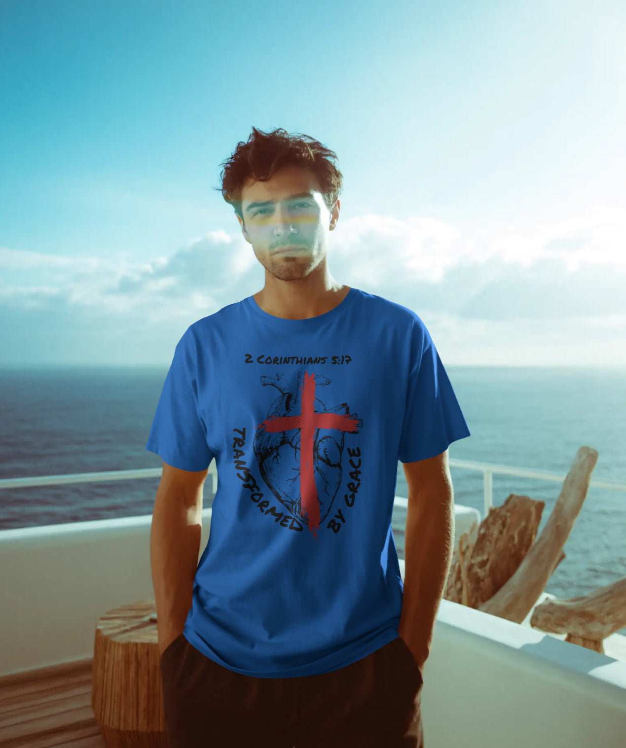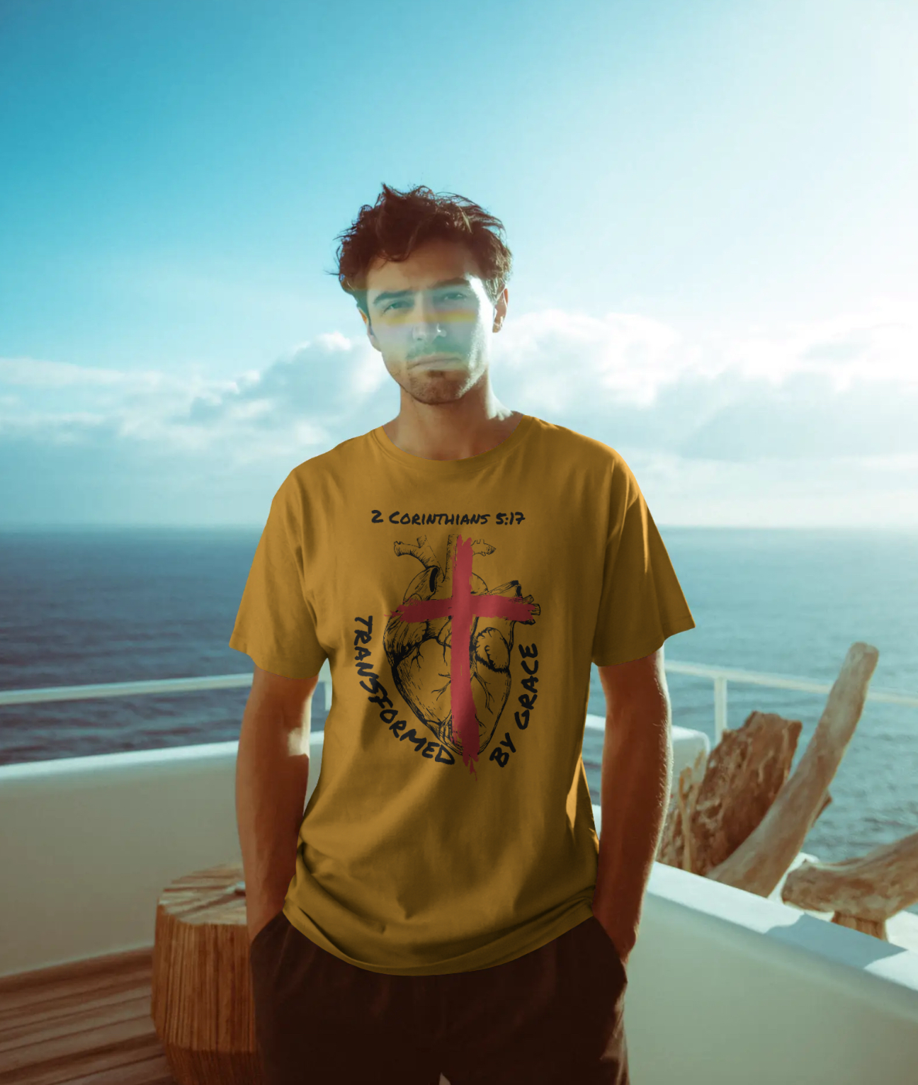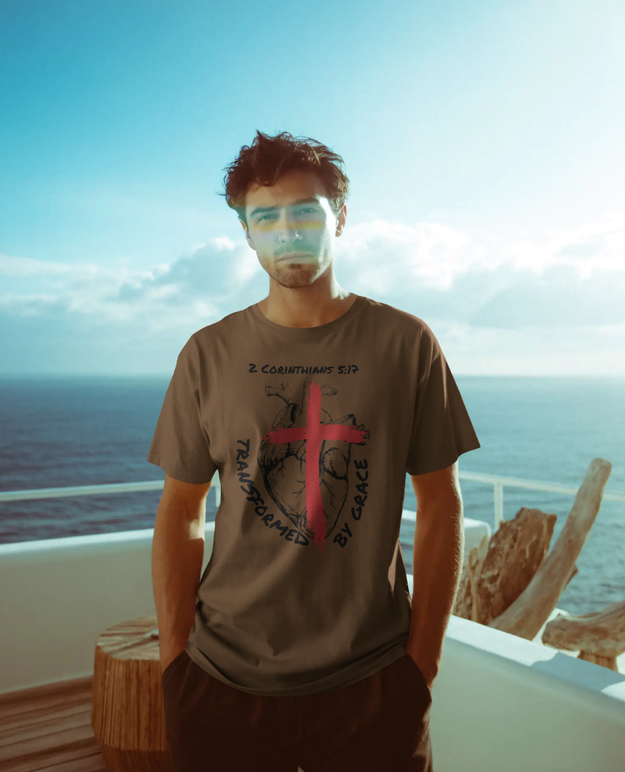 Inspired by 2 Corinthians 5:17, the design features an anatomical heart marked by the cross — symbolizing the moment of surrender where the old life ends and a new one begins. The powerful words “Transformed by Grace” reflect the truth that change doesn’t come by perfection, but by Christ.