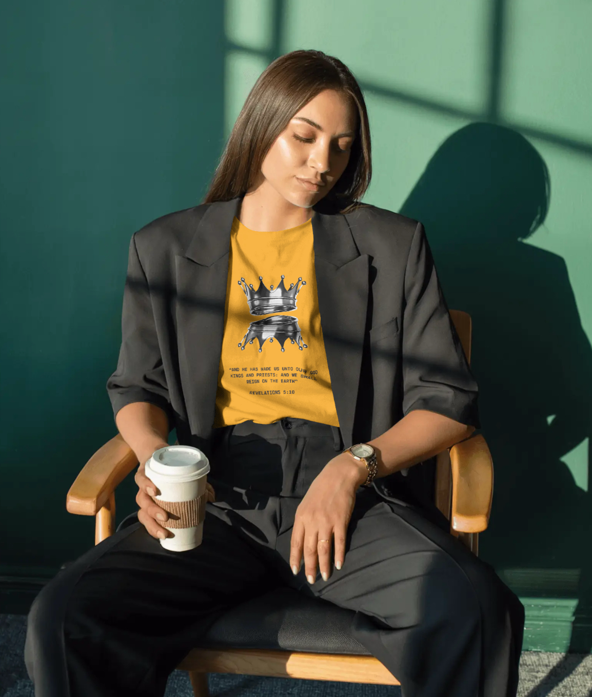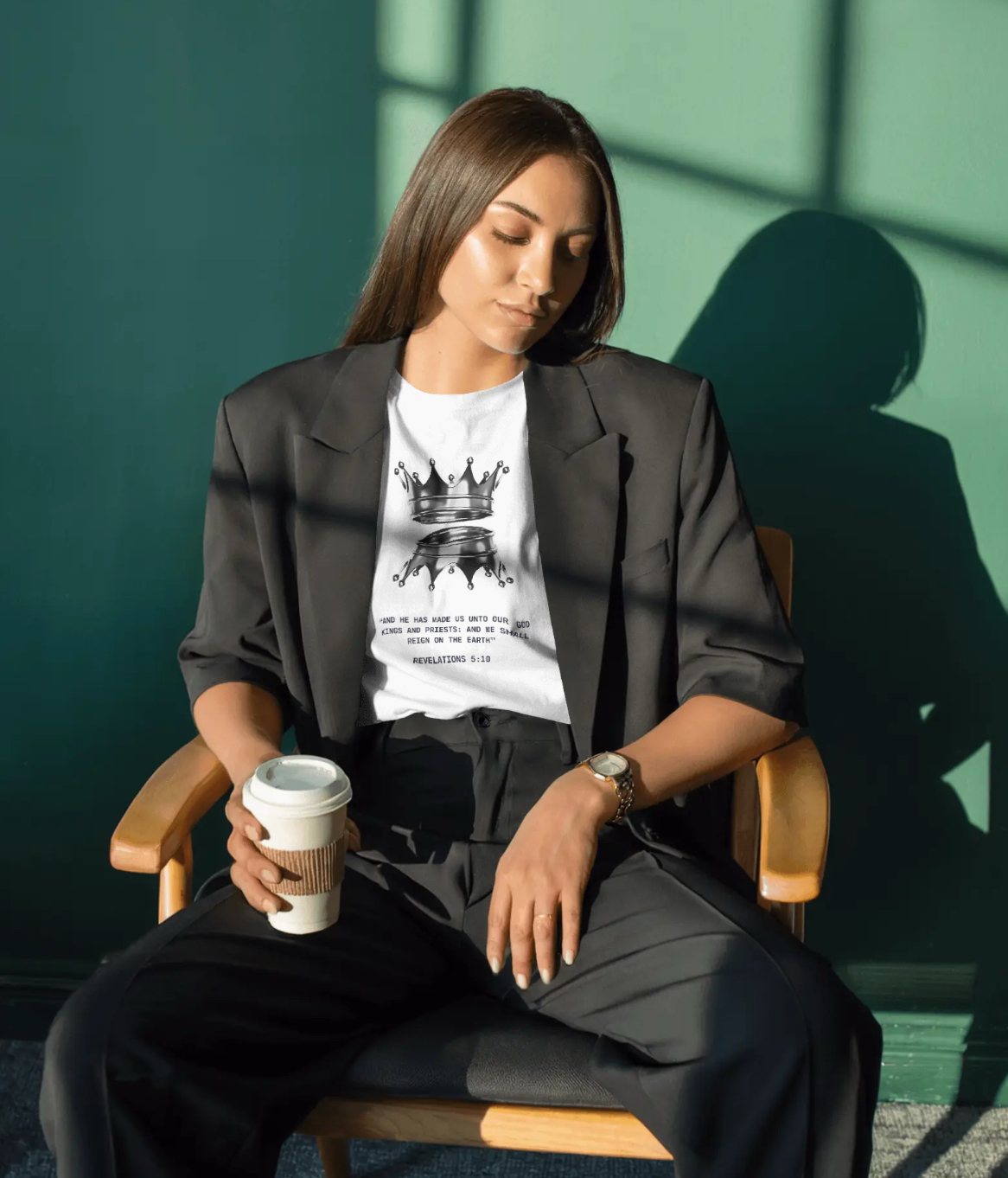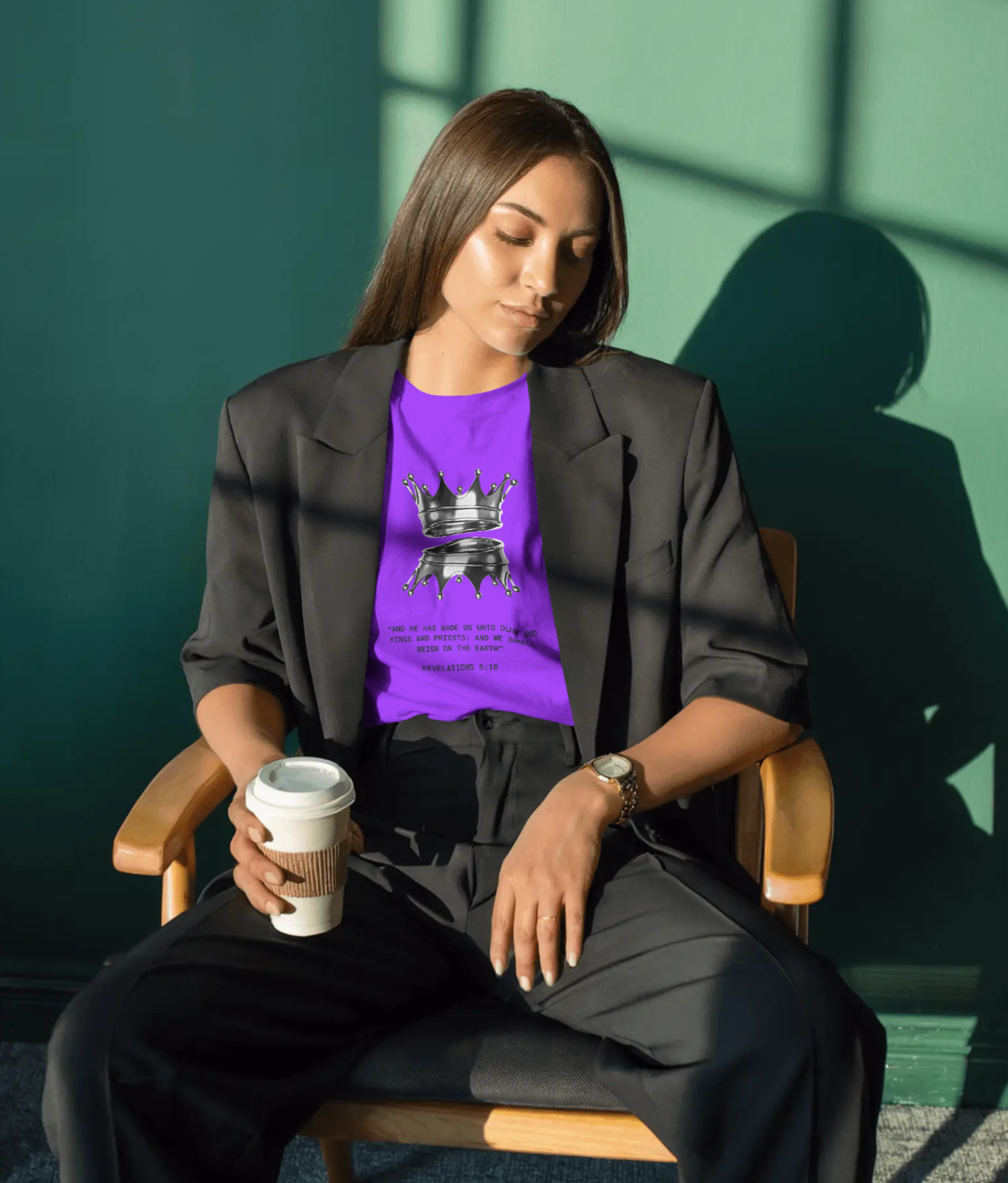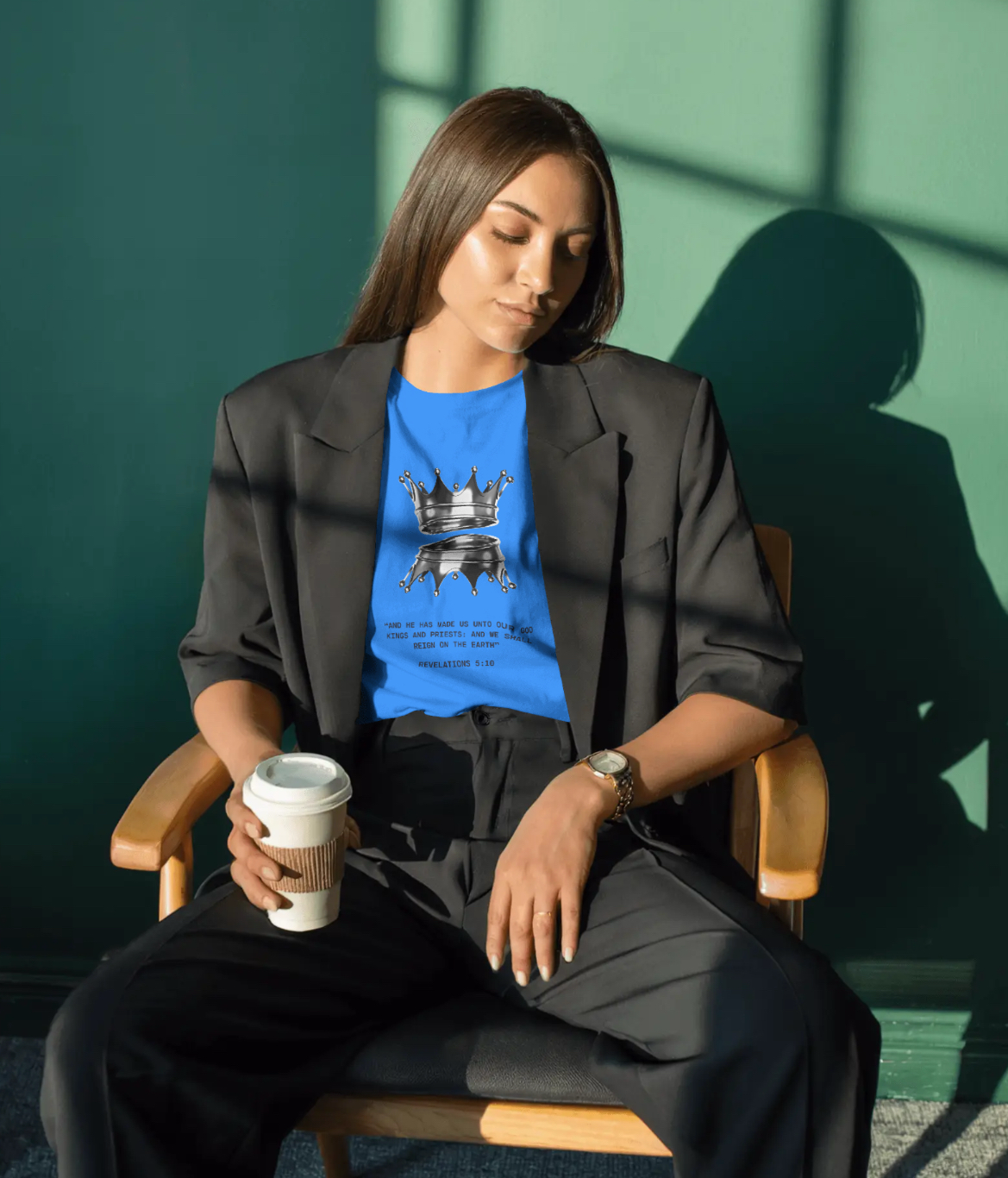 Inspired by Revelation 5:10, this t-shirt is a declaration of identity and authority in Christ. Featuring a striking crown design, it represents royalty, purpose, and the divine calling placed on every believer — kings and priests unto our God.
