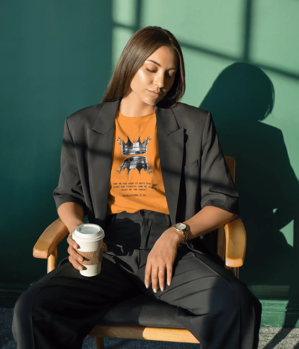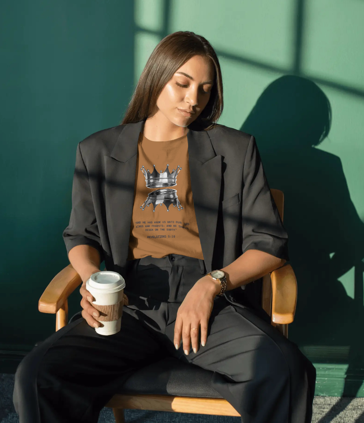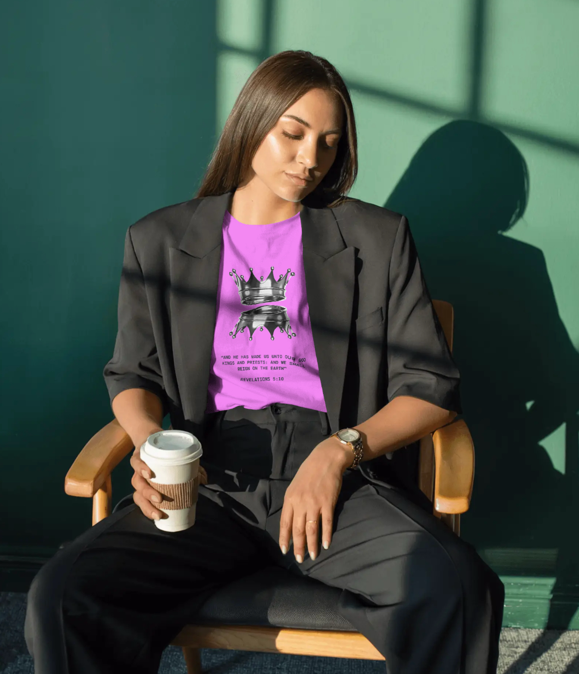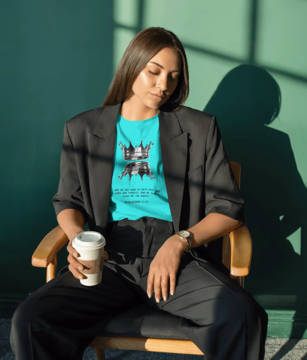 Inspired by Revelation 5:10, this t-shirt is a declaration of identity and authority in Christ. Featuring a striking crown design, it represents royalty, purpose, and the divine calling placed on every believer — kings and priests unto our God.